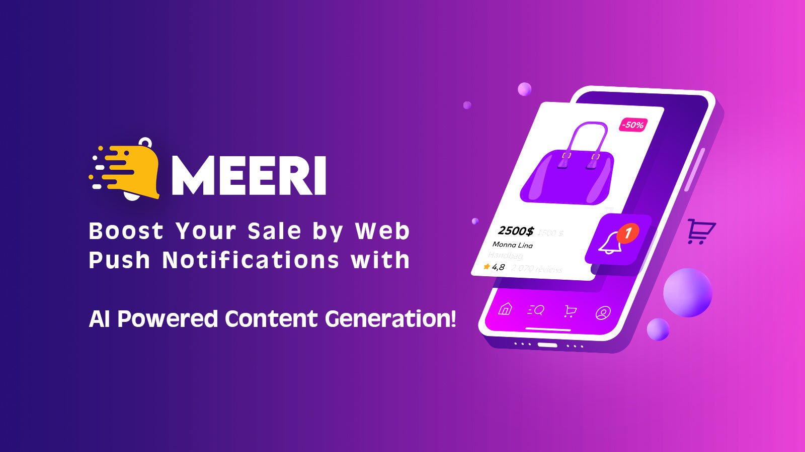 Maximize your e-commerce potential with Meeri. With our powerful push notification feature, you can effortlessly engage with your customers through targeted campaigns, ensuring that your brand stays top-of-mind. Additionally, our app automates the process of recovering abandoned carts, helping you reclaim potentially lost revenue with personalized reminders and incentives. Say goodbye to missed opportunities and hello to increased profitability. Try it today and watch your store thrive!