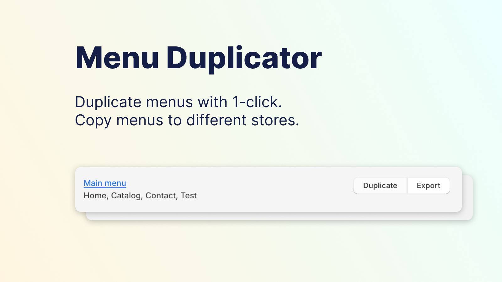 Easily duplicate existing navigation menus. Let's be real, this should be a standard Shopify feature, but here we are. Save hours of tedious manual work and copy menus with one click. We have put in the hard work, so you don't have to. You can also use Menu Duplicator to export and import navigation menus to create backups or to copy your menus to a different store.