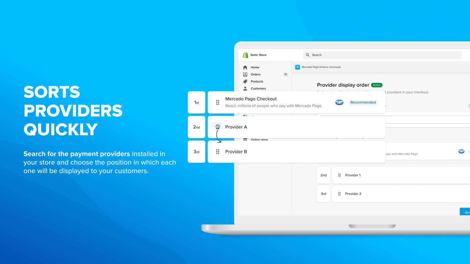 Millions of customers are paying with Mercado Pago right now! Access your Shopify admin panel, enable Mercado Pago as a payment method and add this app to increase the reach of your store by displaying our checkout first. With the “Organize Checkouts” tool, you can also choose the position in which each one of your installed providers will be displayed to your customers.