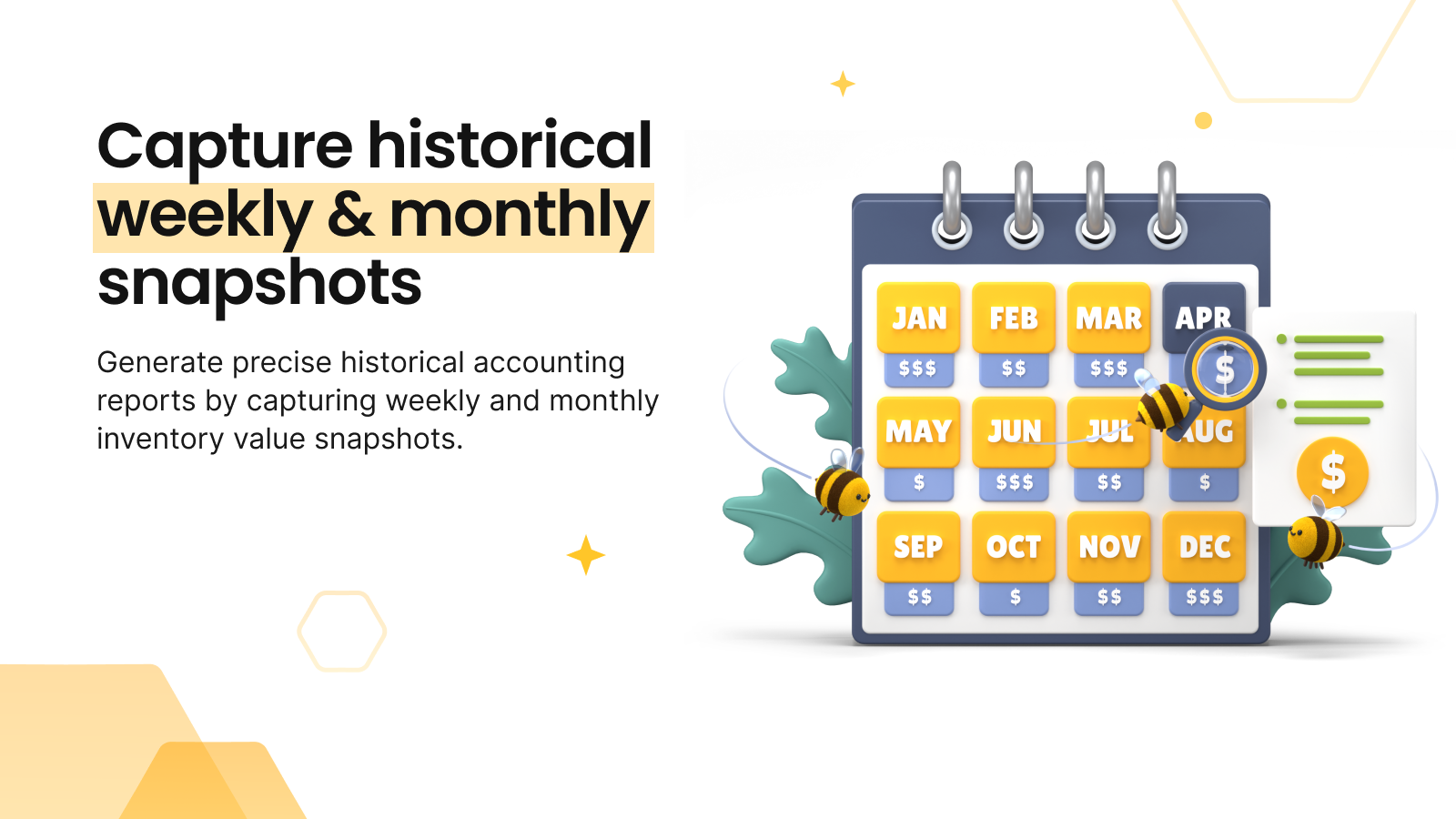 Know your inventory quantity and value in real time! Take weekly and monthly snapshots!