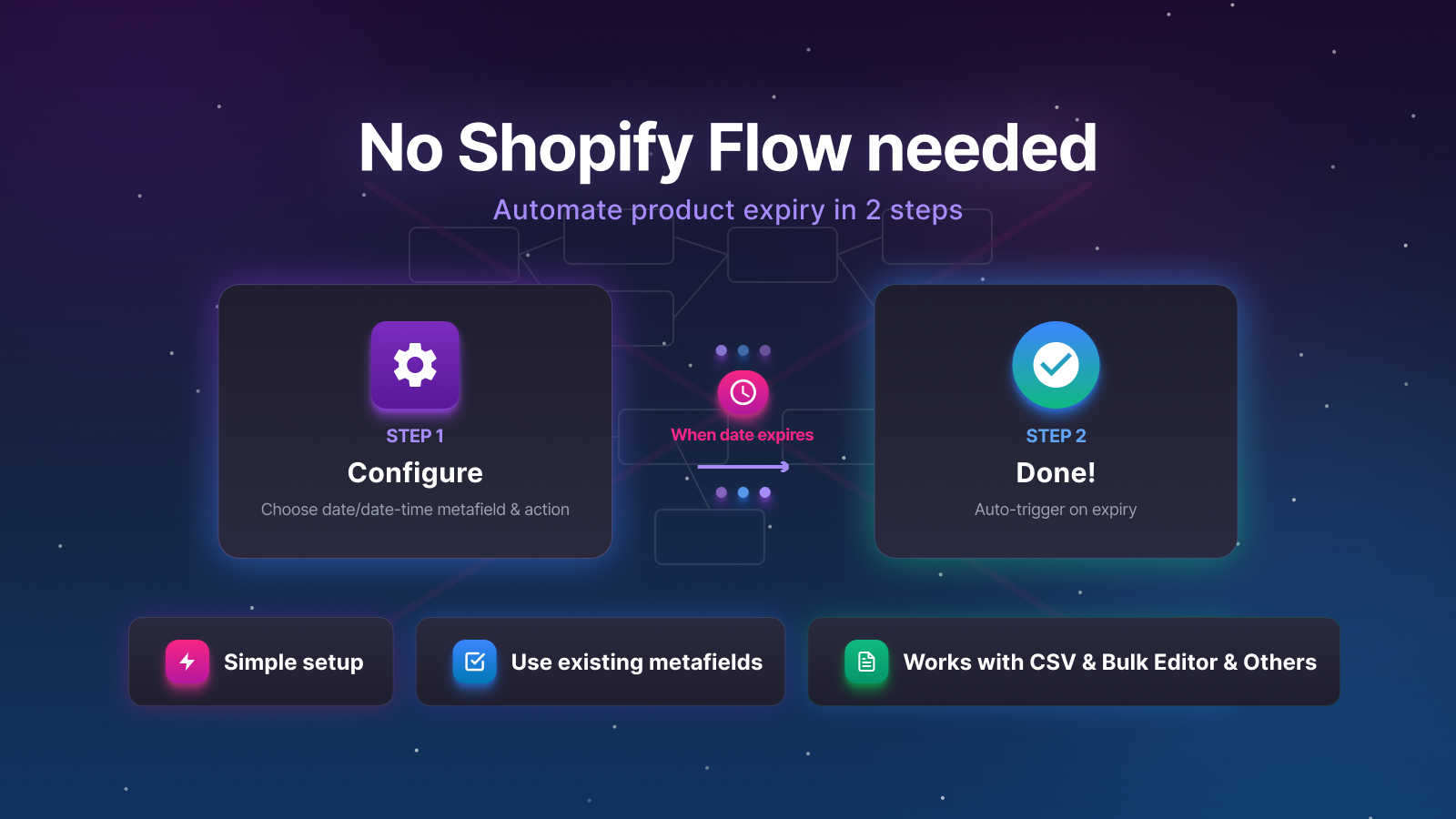 Metafield Expiry automates product expiry actions using a product metafield date/time. You can build this in Shopify Flow, but it can take time to design, test, and maintain: date comparisons, scheduled runs, and iterating through many products may be difficult within workflow limits. With this app, select the metafield and choose an action: unpublish from the Online Store, or set products to draft or archived. Metafield values can come from Bulk Editor, product CSV import, or other tools.