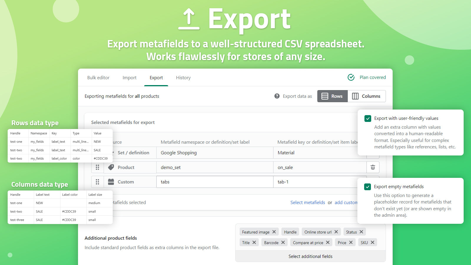 A great store needs high-quality products, rich functionality, and eye-catching design. Are we missing something? Yep, you need the data to power your storefront. Metafields are a great tool to store custom pieces of data like product specifications, downloadable files, related products, Google/Facebook data, banner images, etc. Build a better storefront and deliver a unique experience to your unique customers. Our app got your back with all the features for manual and bulk data management.