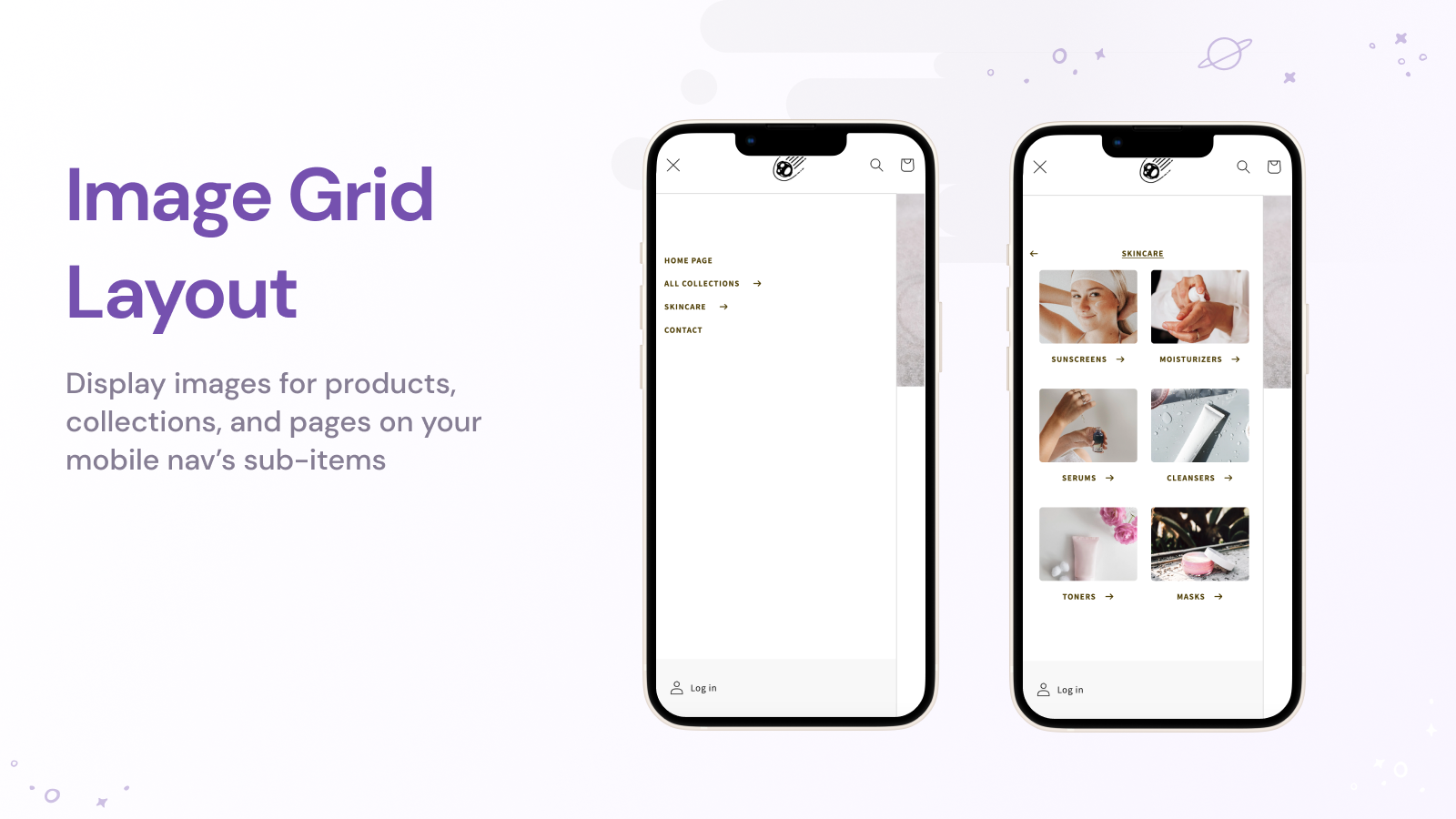 Put your best foot forward with beautiful and professional menu templates. Meteor uses your existing Shopify navigation settings for lightning-fast setup time. Customize the design to your liking, and preview each of your menus before you publish. Show off product images in mobile and desktop menus, and help shoppers discover great products without leaving your home page. Link any resource from Shopify: products, collections, blogs, or pages. Multi-region support for menu items and currency!