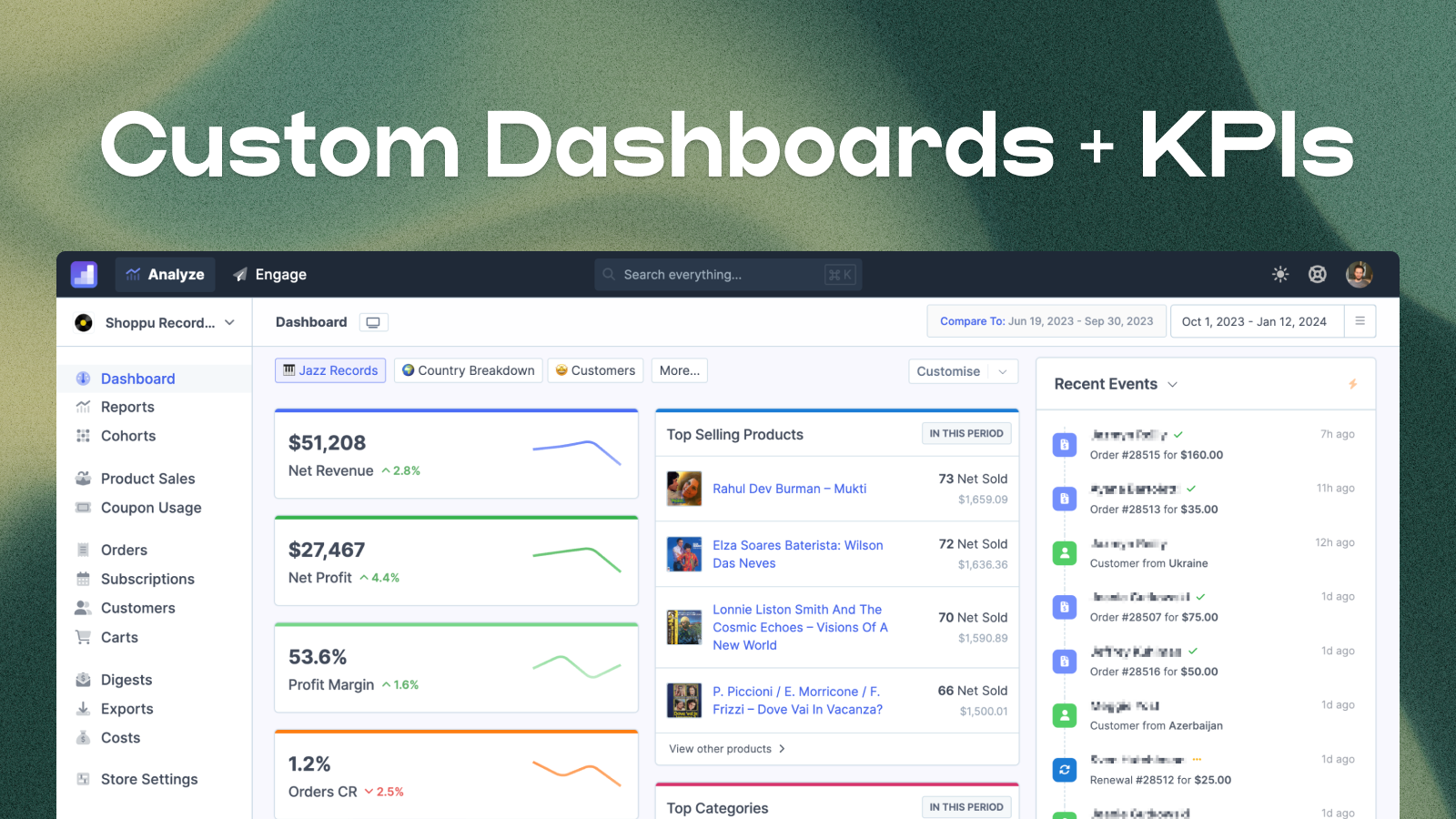 Custom analytics, profit reports, data exporting, and email marketing automation.