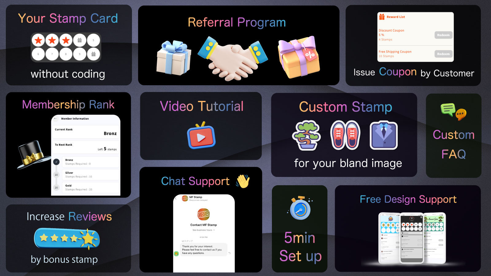 Gamify repeat purchases with digital stamp cards, coupons, ranks, and one-tap referrals.