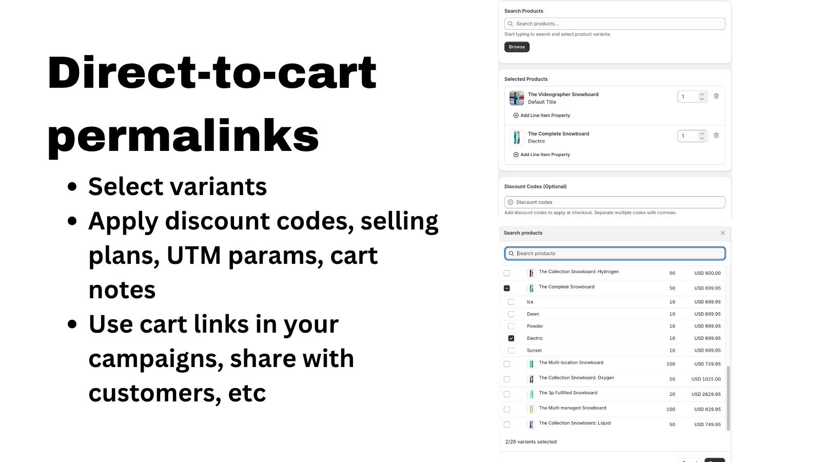 Create shareable cart links with pre-selected products, selling plans, discounts and UTM tracking.