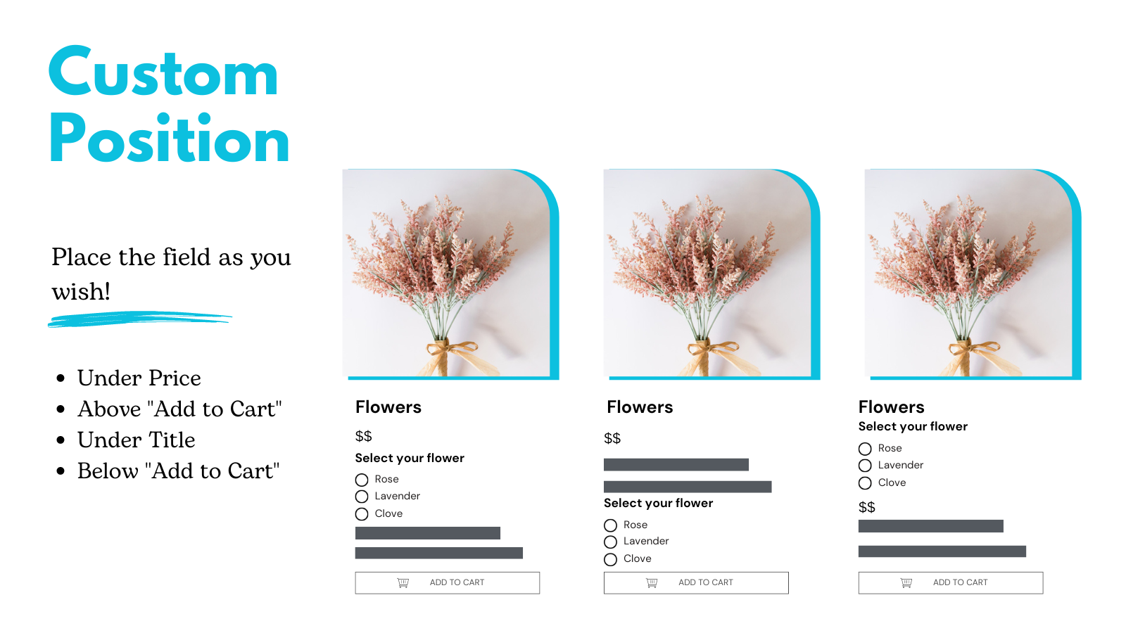 Create customized text box, dropdown, checkbox, image upload and custom field to gather custom input from your clients. Our app lets you add text fields to product page to collect order notes, order form, product options, engraving, checkout fields, gift, personalization, personalisation. Customers can leave a note as product personalizer, custom product. Charge extra fee with product add-on price for custom fields and personalized buying experience. With the surcharge option, increase your AOV!