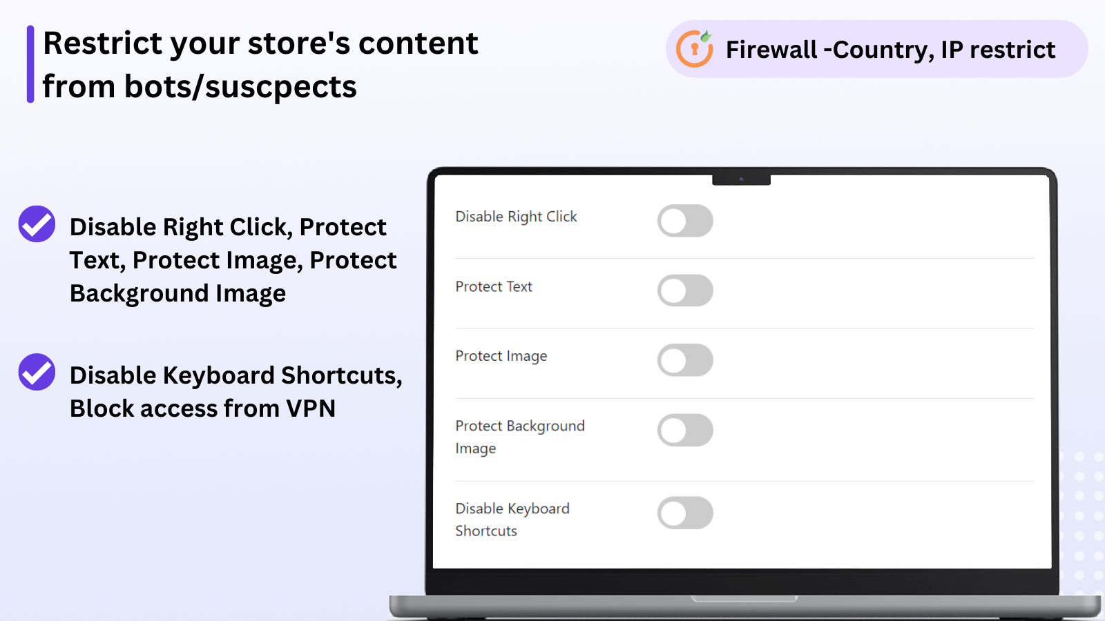 Block Country, Block IP, Block VPN, Block Bots, Block customers, Restrict customers, Protect Store.