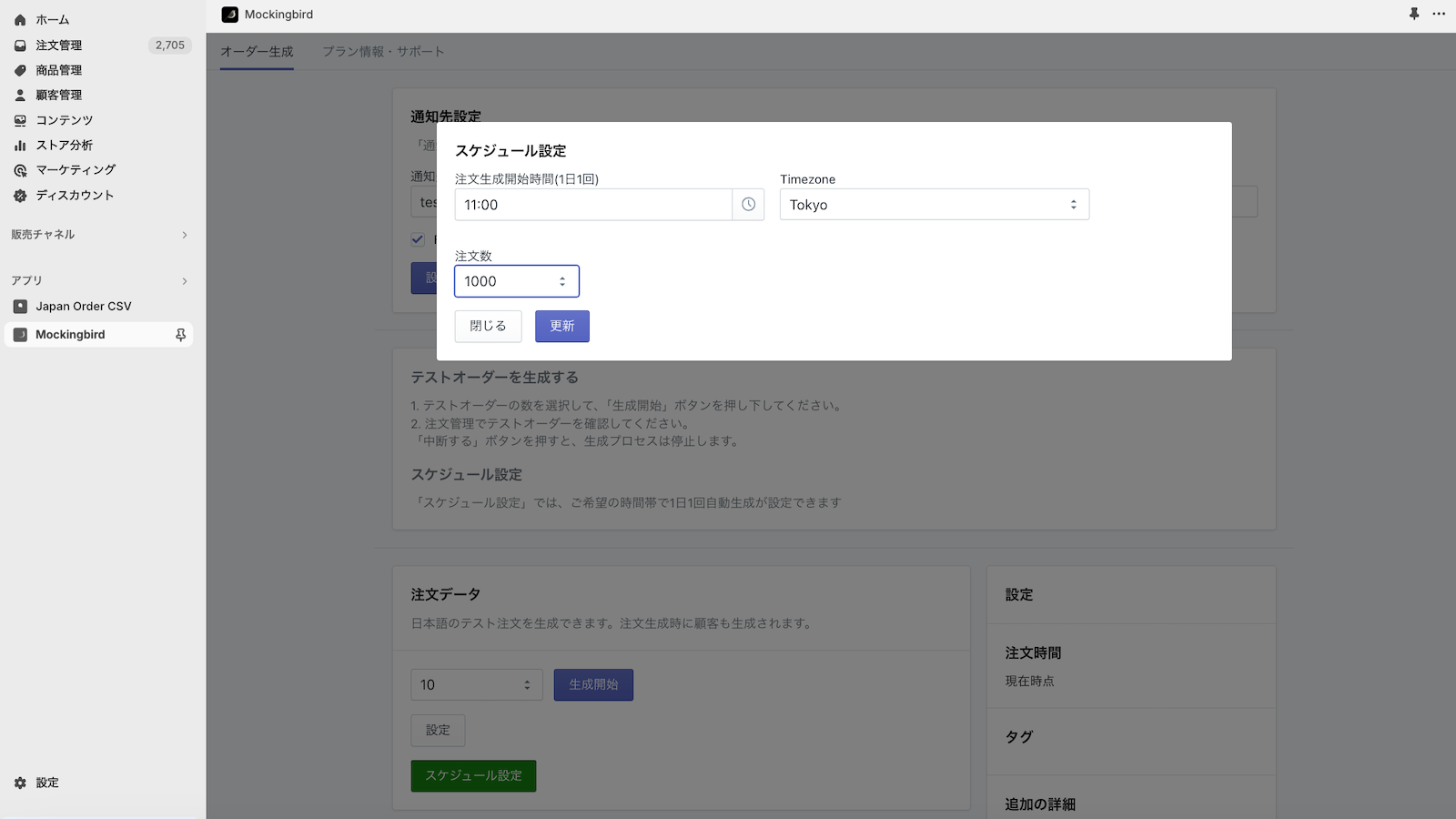 Mockingbirdは、出荷指示など定期的なデータ出力を実際のデータに限りなく近しいテストデータ(モックデータ)を生成できるアプリです。 テスト注文作成の為のリソースを大幅に削減することができます。データの出力・定時出力の試験を、サイトを公開する前に容易に実現することができます。 大量のモックデータをワンクリックで生成でき、スケジュール機能で毎日決まった時間に自動でテストオーダーを作成することもできます。また、生成データには「mockingbird」と「テスト注文」タグがついている為、その他の注文と簡単に識別ができます。更にnote attributeにもデータを追加することができます。 有料版では最大30000件の注文をワンクリックで作成できます。無料版でもお試し頂けますので是非ご利用ください。