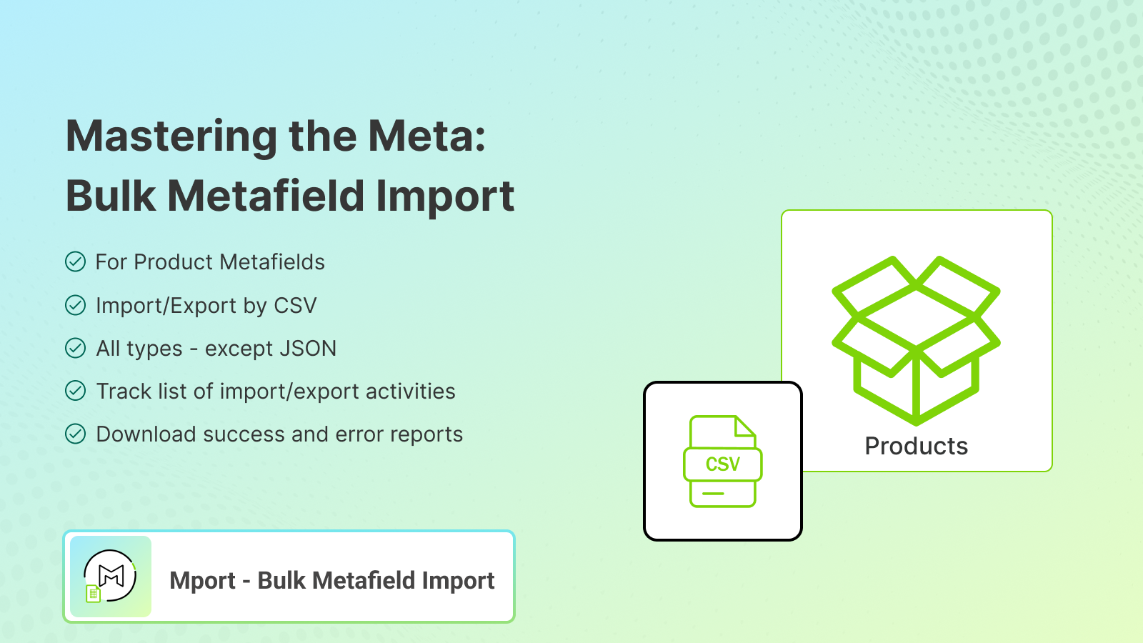 Our Mport - Bulk Metafield Import tool simplifies the process of managing your product metafields. You can import and export bulk product metafields of any data type, including single-line text, multiple-line text, color, date & time, URL, files, and more. Additionally, you can use CSV to import and export product metafields by product SKU or handle. It's important to note that the CSV structure is the same as product import, which helps us prepare your CSV.