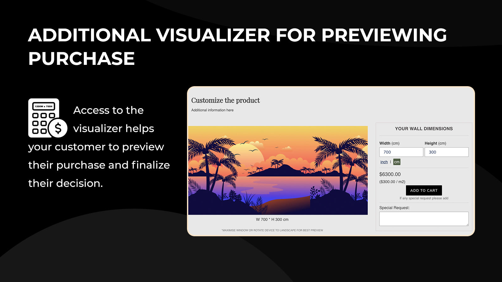 Customers can put in the height & width to calculate the price & visualize product in a custom size