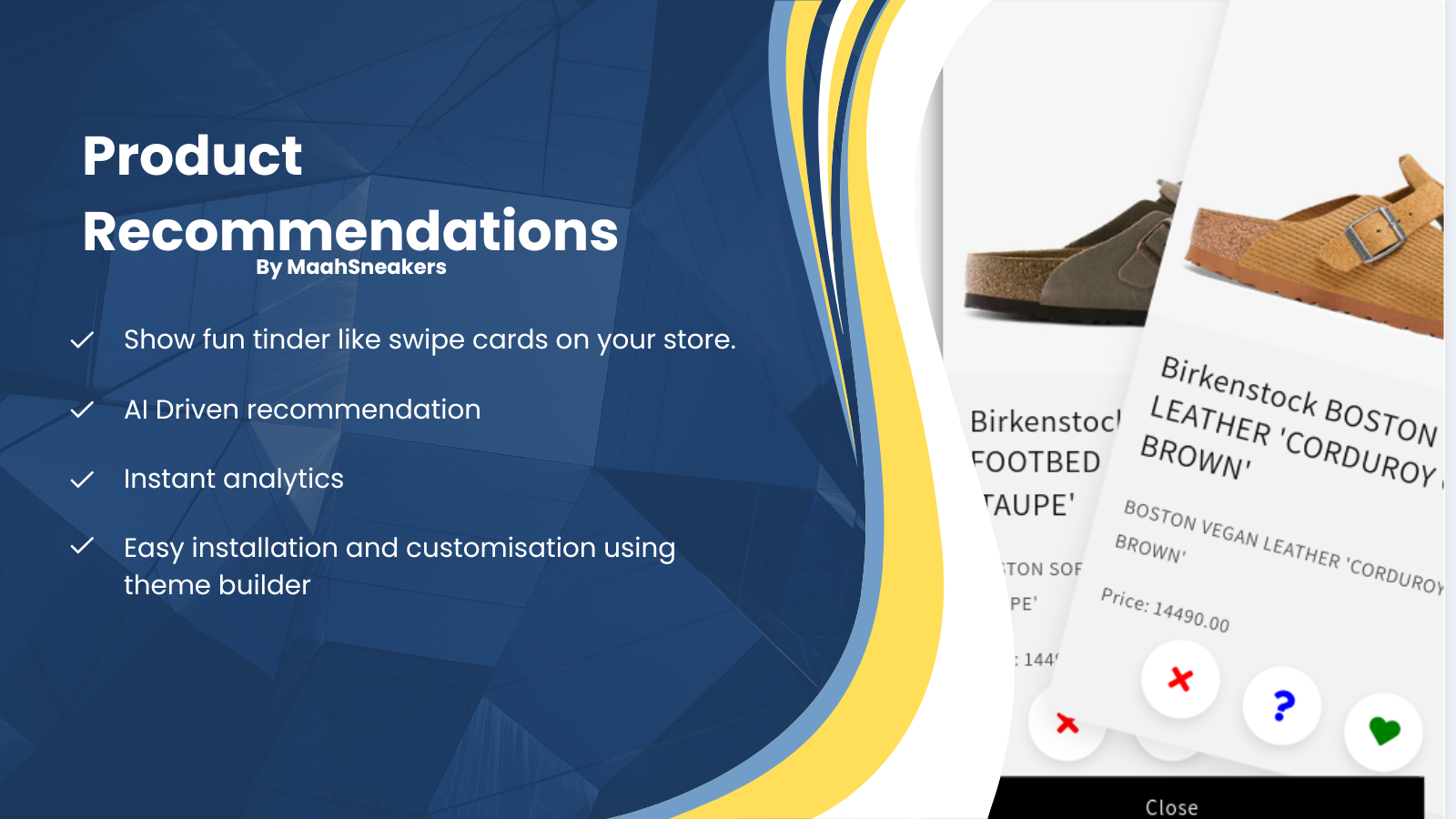 Product Recommendation helps merchants by showing AI driven swipe cards for personalised product discovery. It simplifies product discovery with an intuitive, Tinder like interface. Ideal for stores in fashion, décor, and accessories, it simplifies shopping with an intuitive interface. By solving decision fatigue, it keeps customers engaged, increasing conversions and enhancing their shopping experience. A must-have for Shopify merchants aiming for higher conversions!