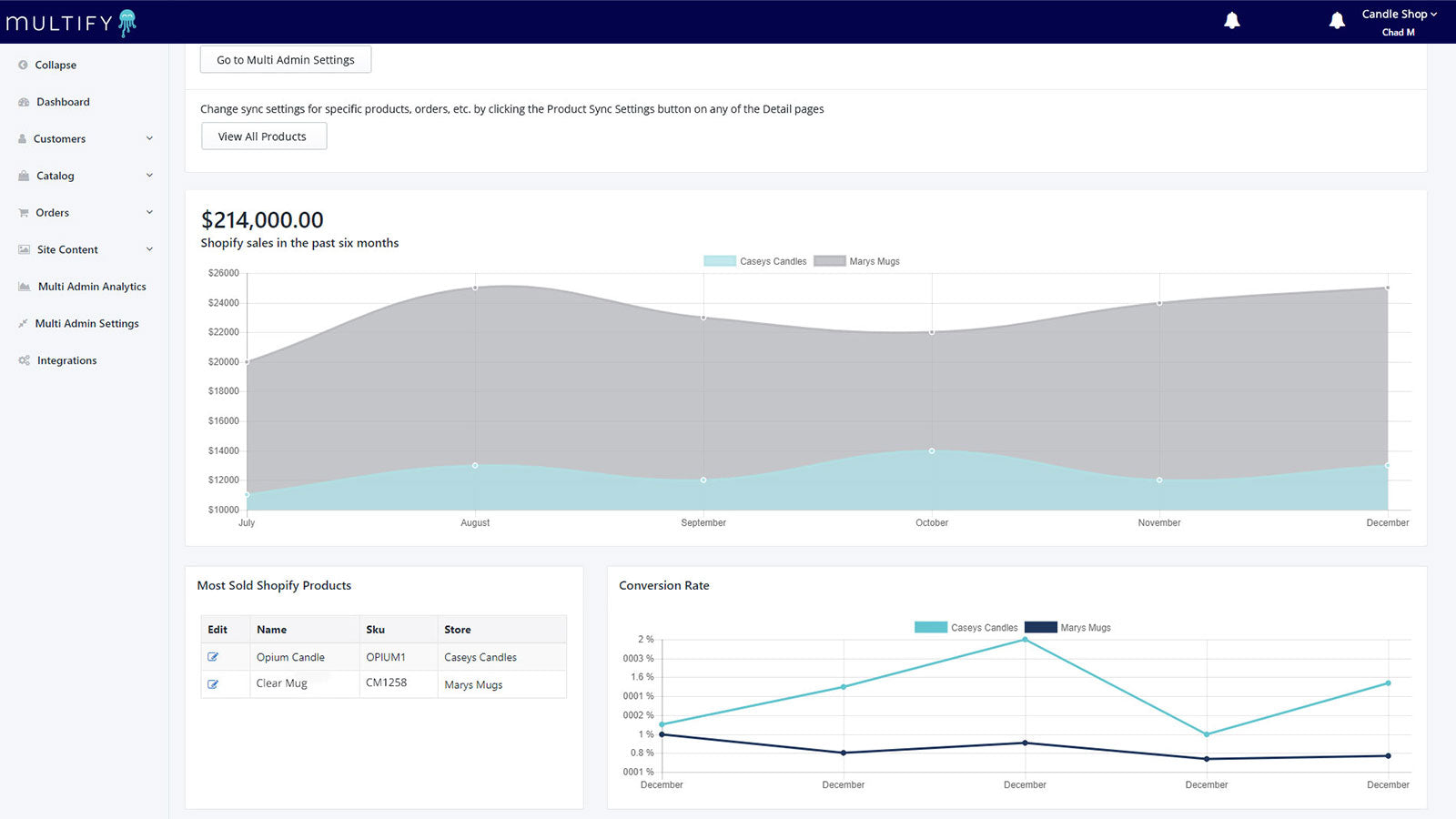 Multi-Admin allows you to sync the following across multiple Shopify stores: Products Collections Inventory Orders Customers Site Content Aggregate Reporting ERP and Warehouse Integrations (requires additional setup)