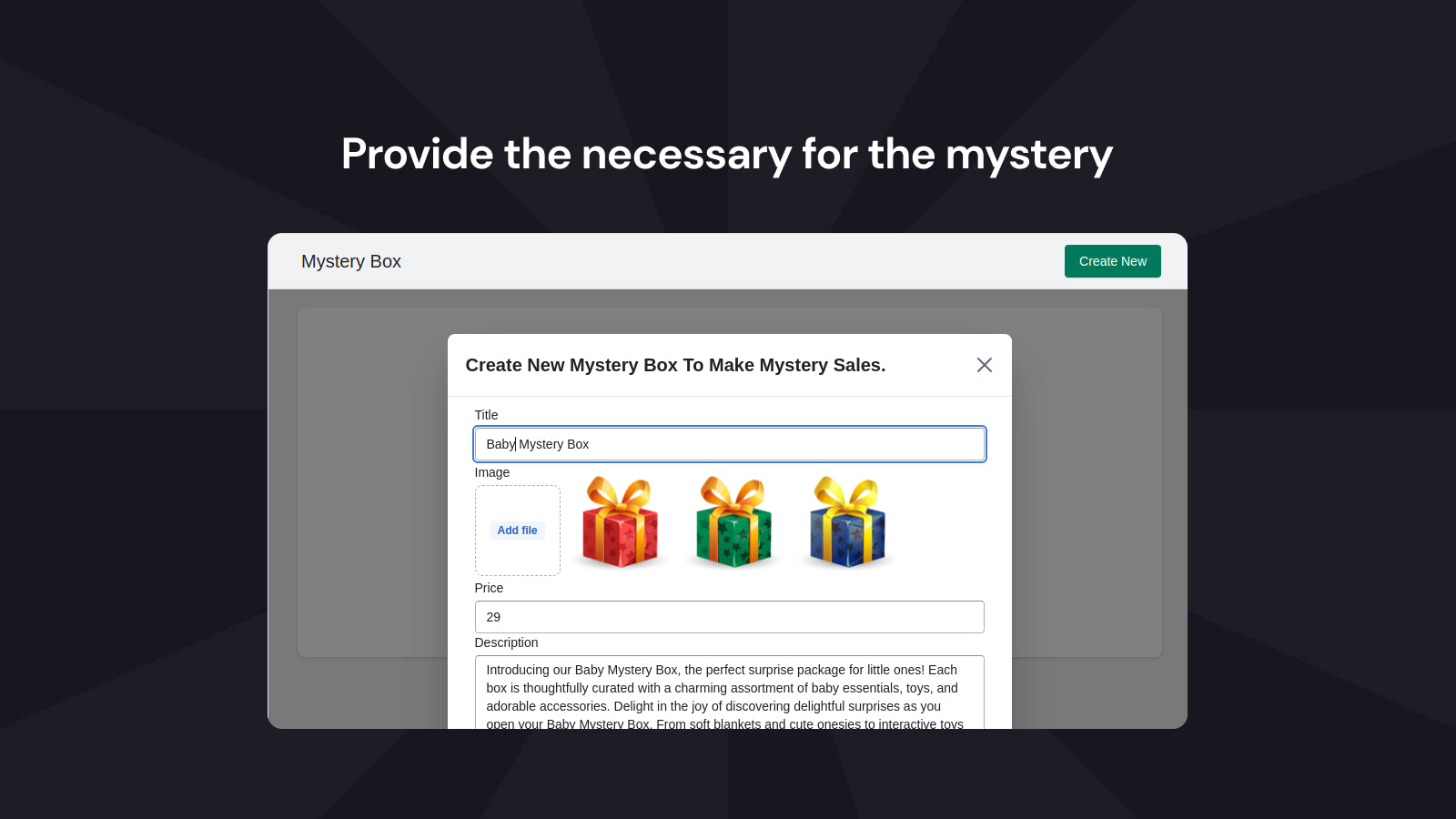 Elevate the customer experience with the innovative Mystery Box application. Unveil the joy of surprise-filled boxes, captivating your customers with thoughtfully curated selections of real products. Mystery box application revolutionizes inventory management by automating the selection process, ensuring seamless fulfillment. Stand out from competitors, foster engagement, and drive repeat purchases with Mystery Box. Enhance customer loyalty and create a buzz around your brand.