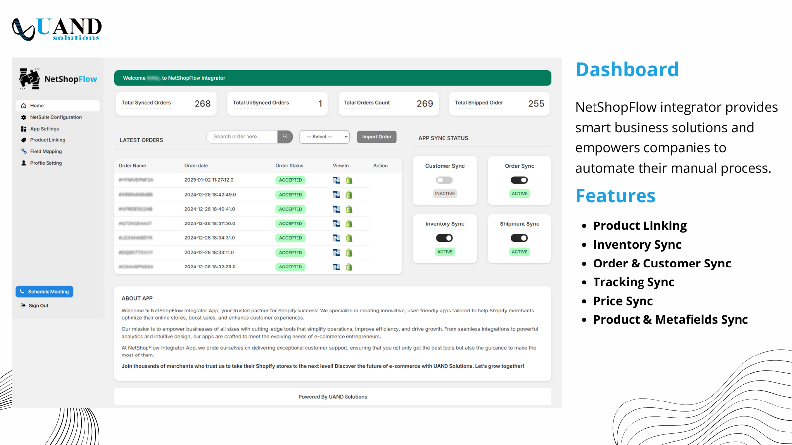 Effortlessly sync your Shopify store with NetSuite ERP using our app. Manage orders, inventory, prices, product updates, and metafields with real-time workflows. Get real-time data updates on orders and syncs directly on the dashboard. Simplify operations with quick activation, eliminating manual data entry. Enjoy seamless, automated order and inventory management between Shopify and NetSuite.