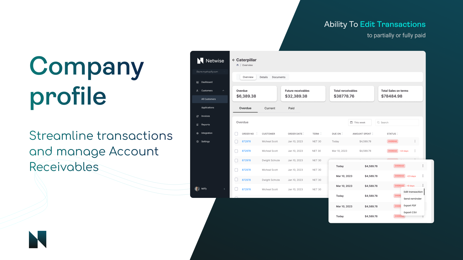 Netwise is a B2B management platform that helps businesses get paid faster. It automates invoice reconciliation, sends automated reminders, credit management for customers and tracks customer payment history with detailed aging reports. Netwise is built to work with Shopify B2B, making it a great choice for businesses that use Shopify.