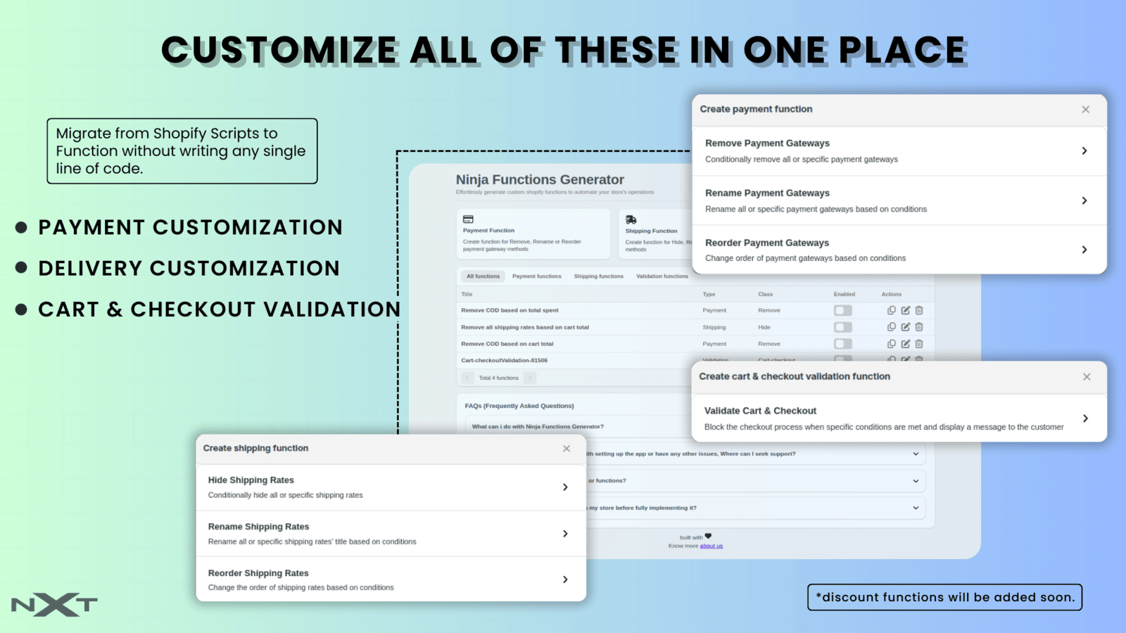 Ninja Functions Generator lets you migrate from Shopify Scripts to Functions without coding. Easily create powerful customizations like hiding, renaming, or reordering payment/shipping methods, and setting cart or checkout rules. Just fill out a simple form—our tool takes care of the rest, making advanced store logic easy to implement.