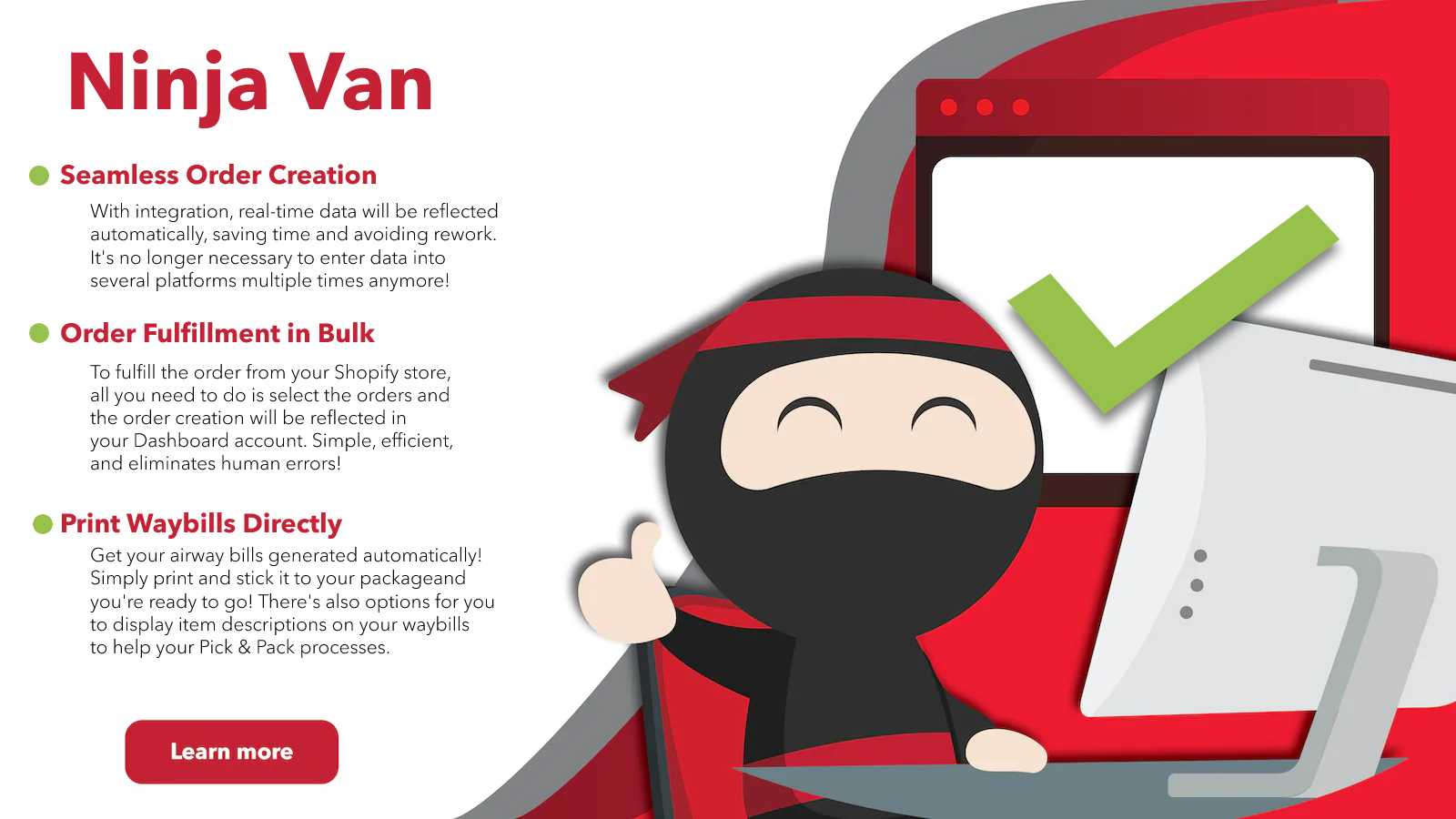 With the Ninja Van app and your Ninja Van account, you can easily create delivery orders, generate and print airway bills, all from the comfort of your Shopify store. No more tedious exporting and editing orders, only to have to upload it on another platform. Designed to be as simple as possible, yet packed with the features to get your orders to your customers as quickly as possible, with as little clicks as possible.