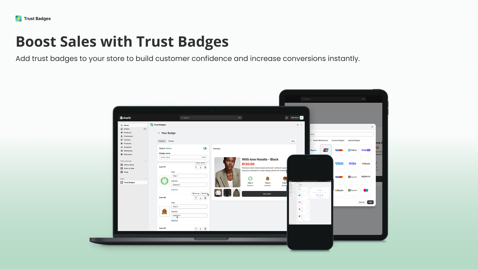 Display trust badges on your store to build buyer confidence and increase conversions.