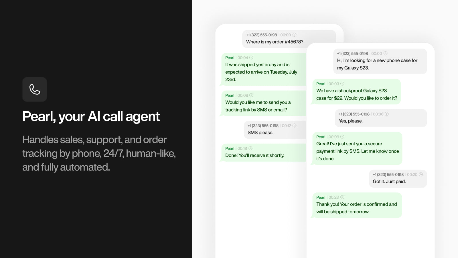 Pearl is an AI phone call agent that answers every call to your Shopify store, 24/7. It tracks orders, handles product questions, upsells, sends SMS and emails, transfers calls when needed, and keeps you updated in real time. Fully automated, multilingual, and store-integrated. Each call is transcribed, summarized, and sentiment-scored. Like a call center, without the cost. Coming soon: auto call-backs for abandoned carts.