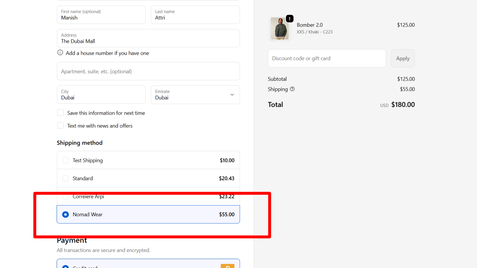 Nomad Wear Shipping connects your Shopify store with the Nomad Wear delivery platform. Shipping rates are calculated at checkout using the Nomad Wear API, and paid orders are automatically submitted for fulfillment. Delivery updates sync back to Shopify. Shipping service is currently available only within the United Arab Emirates (UAE).