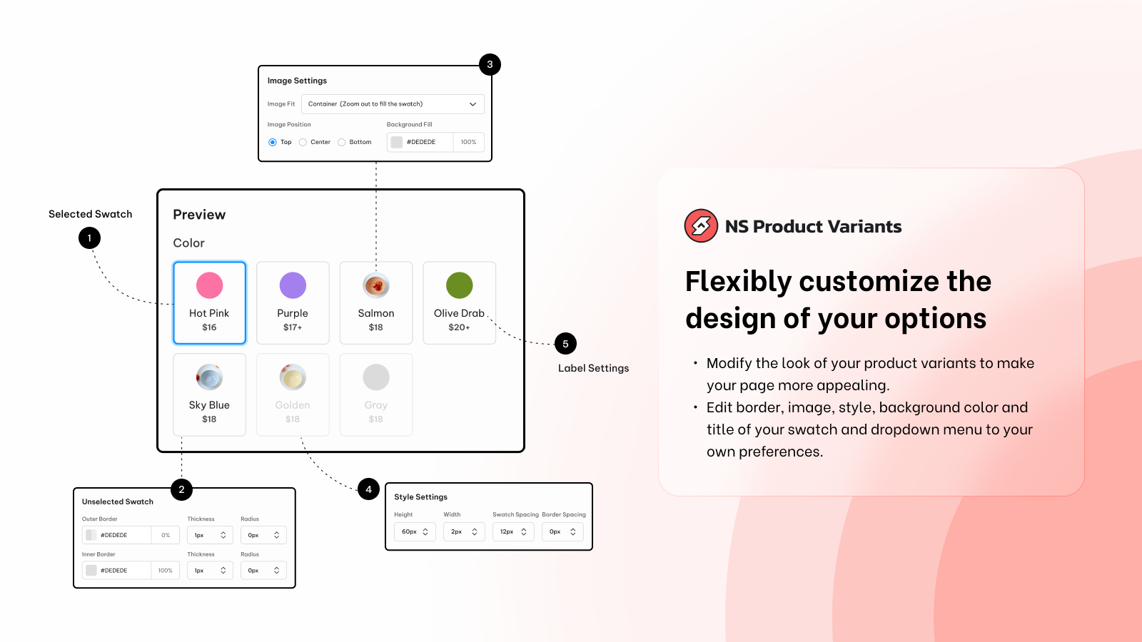 Display product options with images, color, text swatches & dropdowns on product & collection pages.
