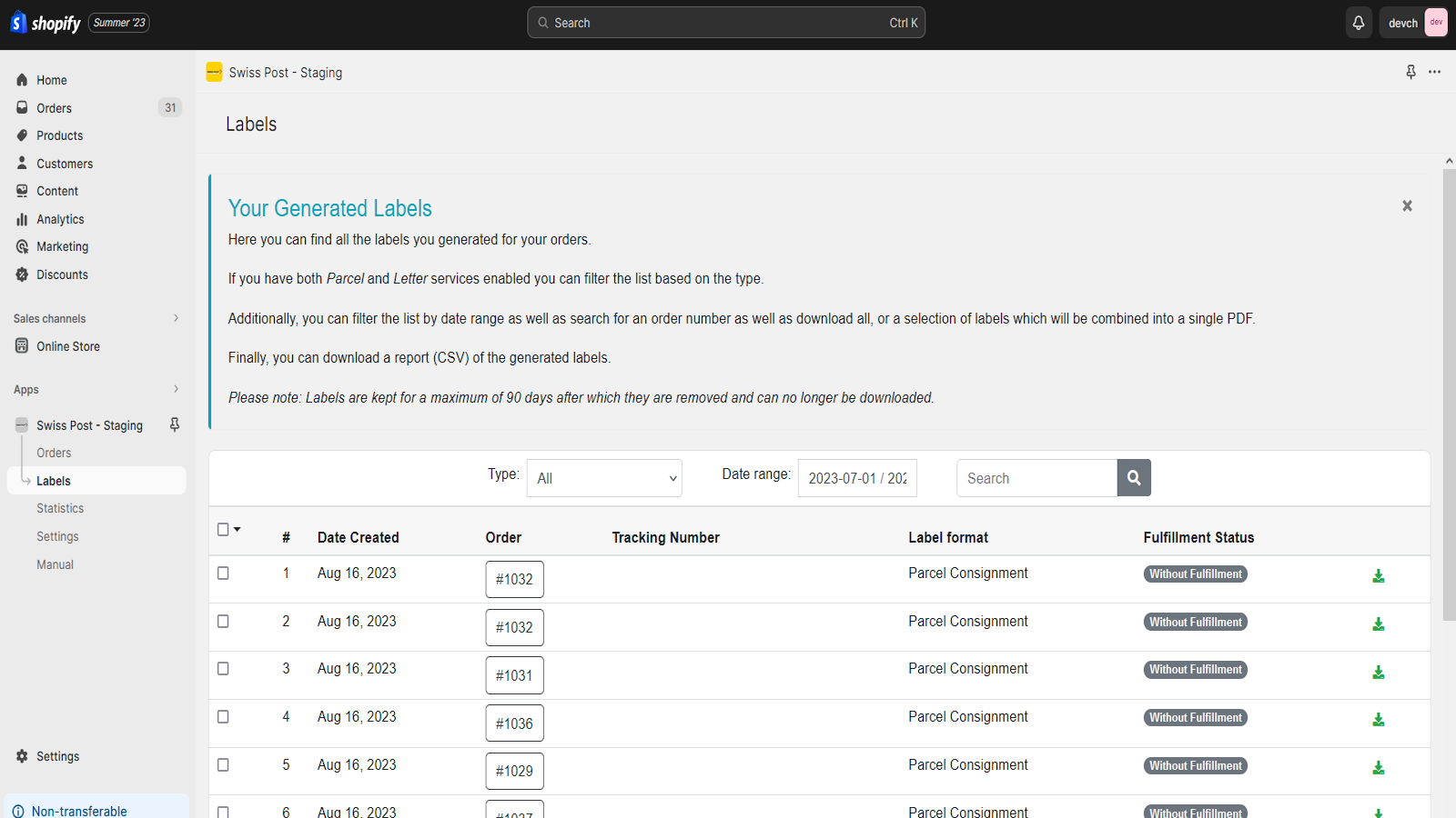 ##Shipping Labels Easily create Swiss Post shipping labels for your orders directly from the orders page. ##Address Validation Check the quality of the shipping address using the Swiss posts address validator ##Generation of webstamps