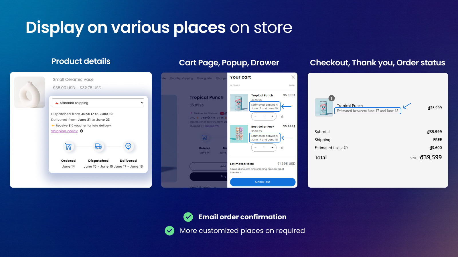 Omega Estimated Delivery Date by Synctrack® helps you display timeline graphics and estimated delivery date information (EDD/ETA) such as dispatch date, shipping date, delivery time, and delivery date. Estimated Delivery Date app allows you to show animated estimate shipping dates on products, cart, checkout, thank you, order status page & order email. Stores with clear delivery expectations received fewer customer support requests, building consumer trust and increasing sales conversion rates.