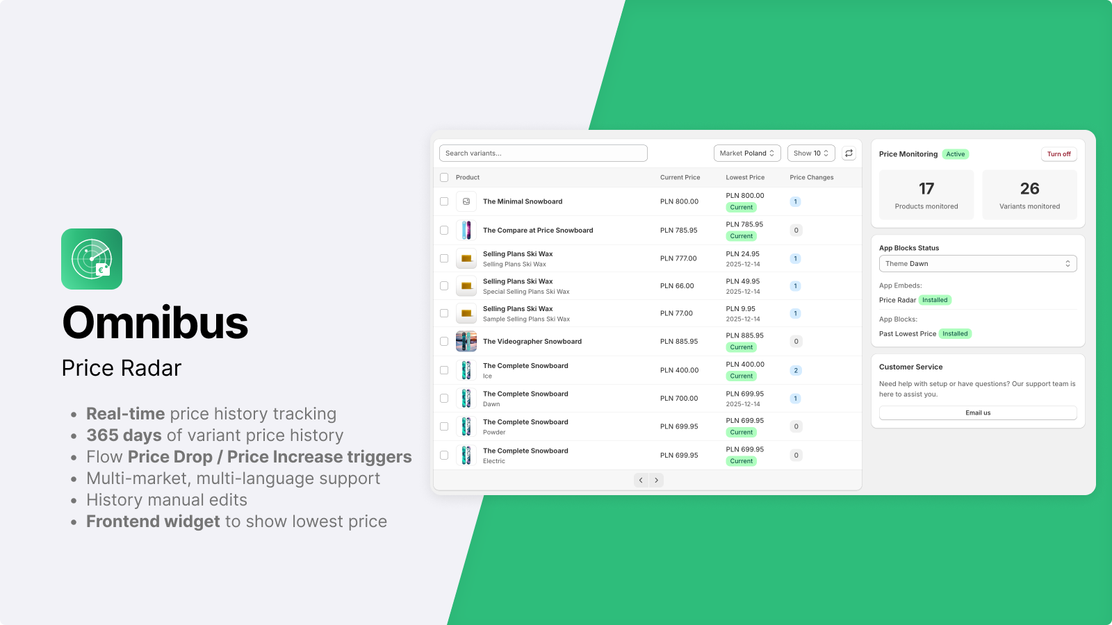 Omnibus Price Radar helps merchants comply with the EU Omnibus Directive by automatically tracking price history for all products. The app monitors price changes in real-time and displays the lowest previous price on your storefront, building customer trust when advertising discounts. It integrates with Shopify Flow for automated workflows on price changes and supports multiple markets and currencies. Setup is instant - your catalog syncs automatically upon installation.