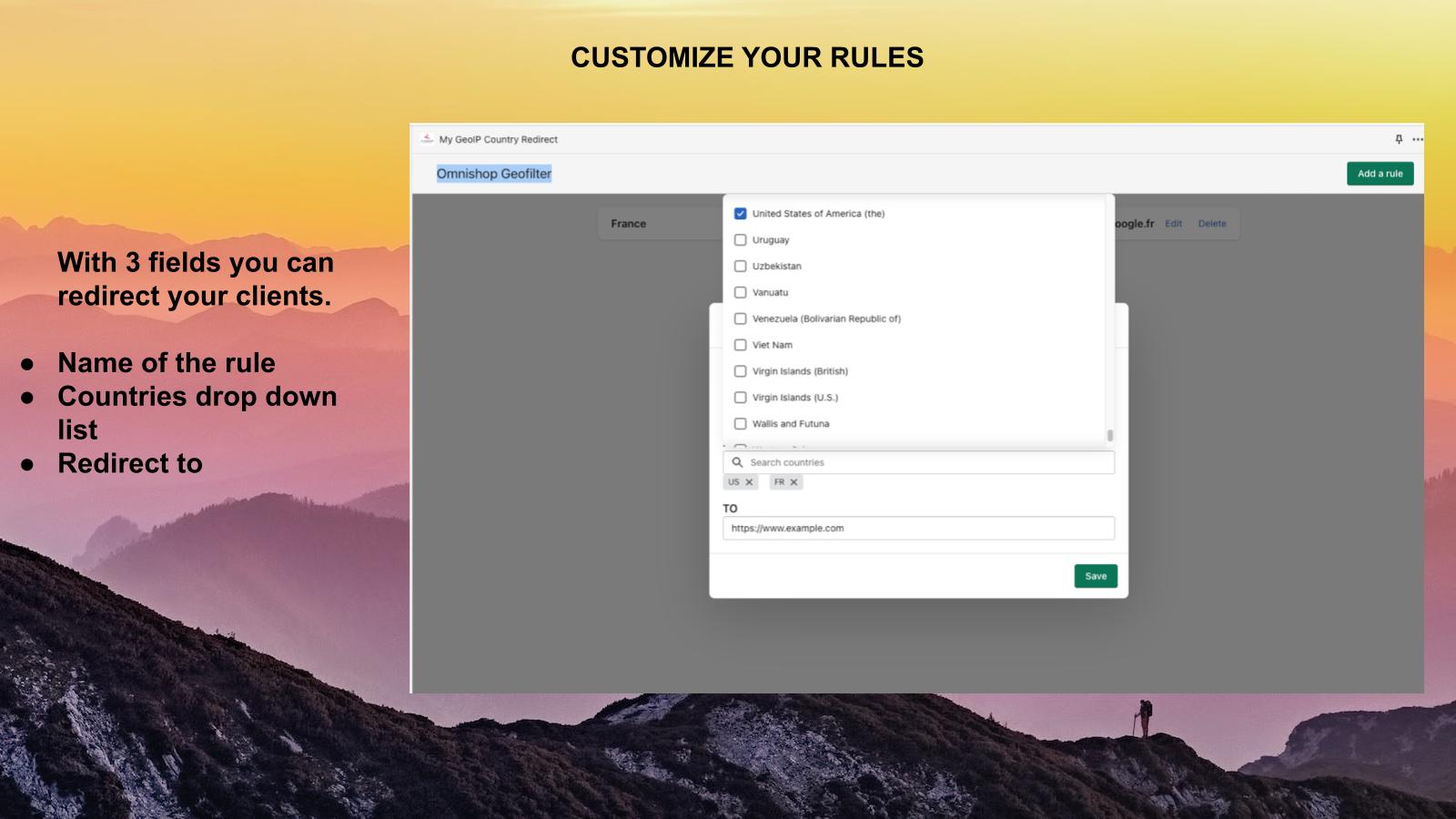 If you have multiple stores for multiple countries you need to use this app! Based on geolocation you redirect or block visitors. Geolocation is based on visitor's ip address. This app helps you to target the better international stores fit for your customer. Better experience for the user and better conversion rate for your store. We don't redirect search crawlers bots. We don't distort your statistics. We don't touch your SEO.