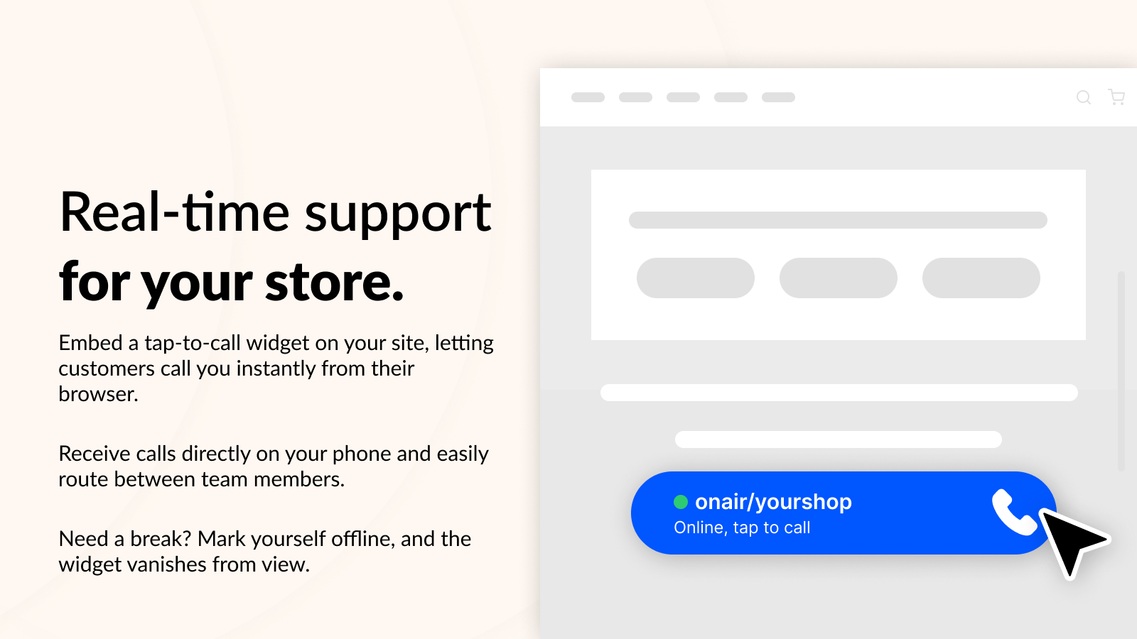 How many potential customer landed on your store, had a question, but did not find someone to speak to? OnAir embeds a sleek "tap to call" widget on your store. Customers can call you from their browser (no app downloads!). You receive calls directly on your phone, while you're on the go. Mark yourself offline and the widget will vanish until you're back online. Route calls between your colleagues. Transcribe calls. And so much more!