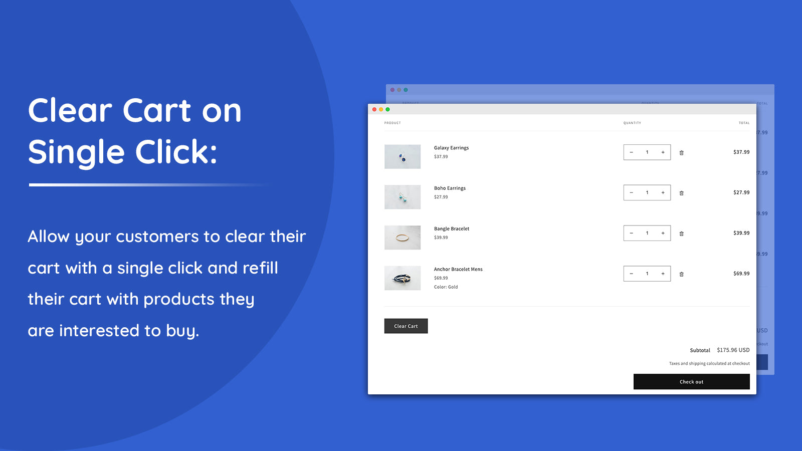 One-Click Clear Cart app allows you to display a clear cart button to let customers clear their carts and start fresh by re-building their cart with other products. Show clear cart to specific customer tags and when the cart basket contains more than X number of products. With this app, the store admin can choose to automatically remove redundant carts after specific time to save resources.