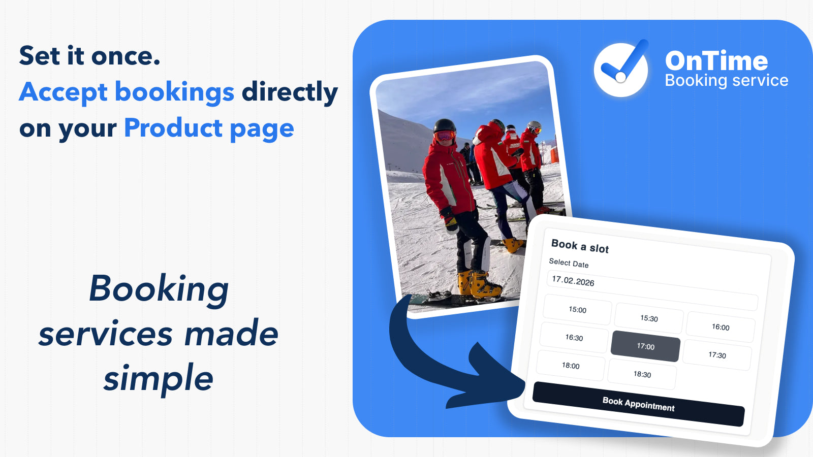OnTime lets merchants offer online bookings for services, classes, and appointments directly on their Shopify store. Merchants can define availability, manage time slots, and control booking limits from the Shopify admin. Customers select a date and time during checkout process, helping merchants streamline scheduling and reduce manual coordination.