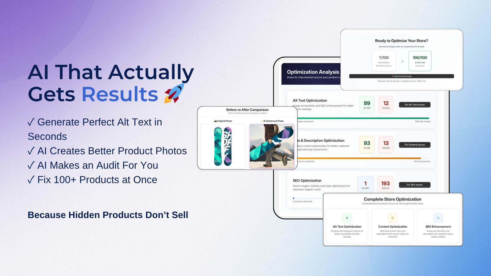 Complete AI product optimization platform featuring automated alt text generation and AI image consultant for creating improved product visuals. Also optimizes product titles, descriptions, SEO meta titles, and meta descriptions. Our comprehensive audit analyzes your entire store, while AI provides personalized recommendations based on your business type and target market. Bulk optimization processes multiple products efficiently, improving search visibility, accessibility, and sales performance