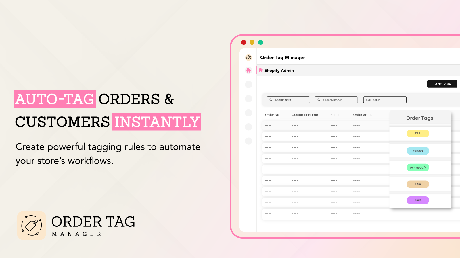 Streamline your Shopify order management by auto-tagging orders based on custom rules. Our app allows merchants to create tagging rules using order details such as city, country, amount, and payment method. Tags are applied automatically, reducing manual work and helping organize orders efficiently. Designed to support smoother operations and save time in managing your store’s workflow.
