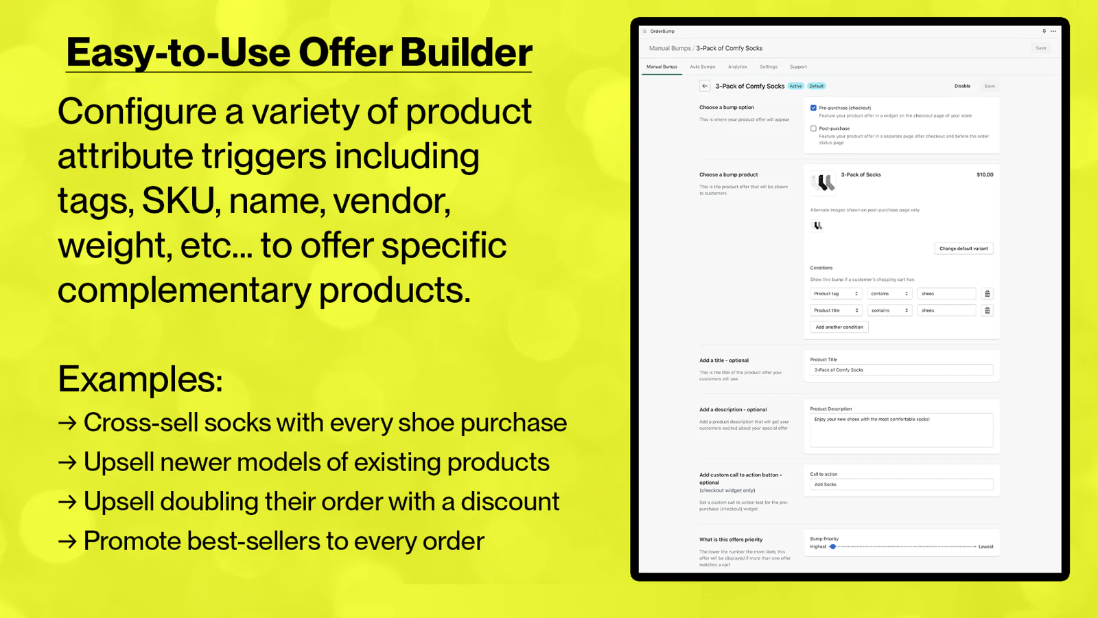 Upselling is easy! With OrderBump you can set cart conditions and create perfect complementary product offers at checkout, in cart, on the checkout page, & through post purchase upsells and cross-sells. Create customizable product titles, descriptions, and CTA buttons make it easy to persuade customers to take advantage of our upsell offers. OrderBump is easy to setup with helpful support. Try OrderBump today & start increasing your store's revenue through checkout bumps, upsells, & cross sells!