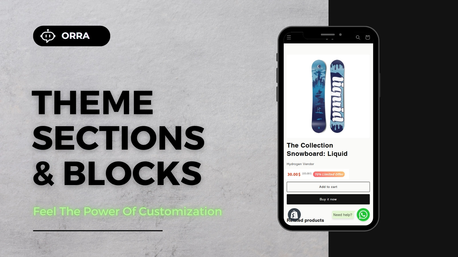 Easily enhance your store’s shopping experience with Orra’s flexible theme sections and blocks! Add a fully customizable WhatsApp Chat Button to your store, allowing customers to message you directly via WhatsApp with a pre-filled inquiry — improving engagement and response time. Plus, with Price Customization Color, you can adjust the color of your product prices to perfectly match your store’s branding and style — helping highlight offers, discounts, or simply improve your visual consistency.