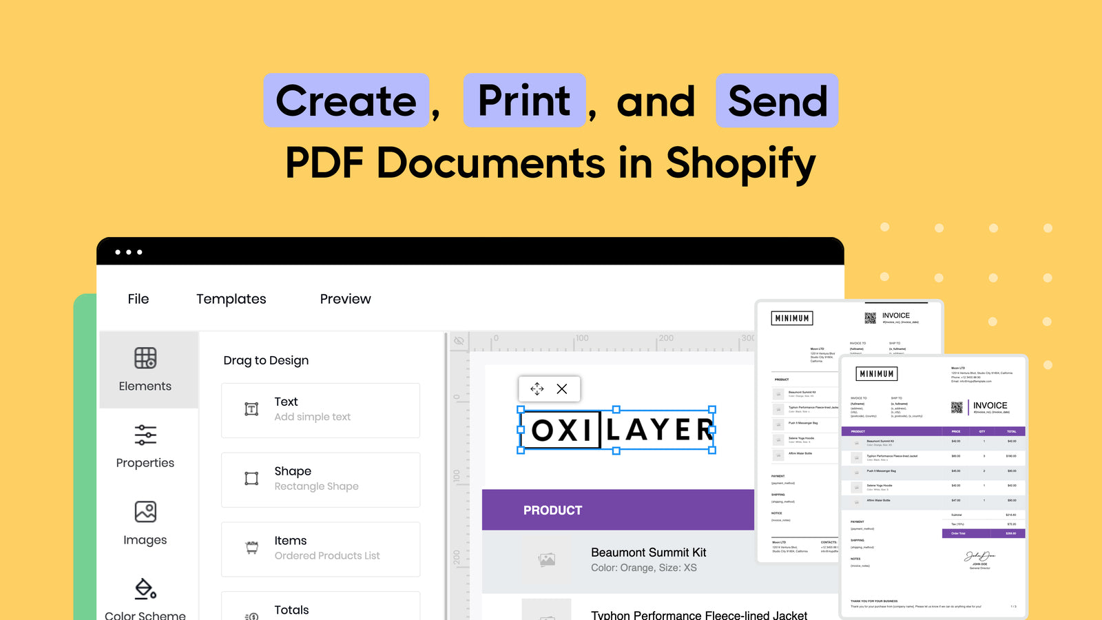 The Oxilayer Invoice app helps you to create invoices, orders, drafts, fulfillments, returns, and refund PDF documents. It is easy to get started using prepared PDF templates. Our user-friendly PDF editor allows you to create custom branded PDF templates. Once the templates are ready, set up PDF links and automatically deliver PDFs to customers. All of that is backed with free support for all