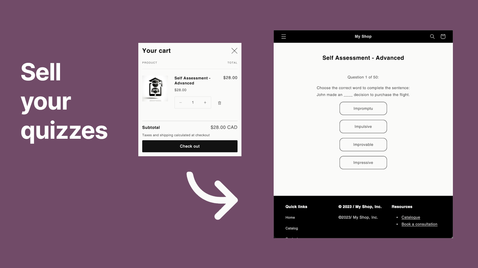 Make a quiz, charge customers—all-in-one Shopify solution. Create an interactive quiz and sell it as a digital product. Zero-risk to start, upgrade when you're ready. Quizzes delivered within your online shop for a professional and seamless customer experience. Great for exam prep, knowledge and skill testing, proficiency assessments, personality typing, anything you can make into a quiz. Make a paid quiz and start making sales.