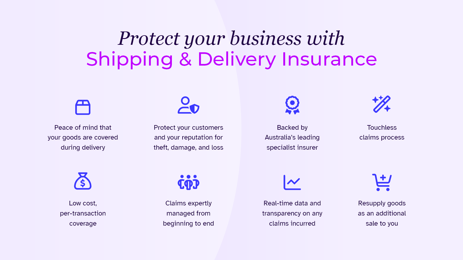 Parcel Protect is powered by NTI, Australia’s leading specialist in all things shipping, delivery and logistics. We offer you and your customer’s peace of mind with protection against theft, damage and loss of items during shipping. Our app makes it simple to integrate per transaction coverage into your e-Commerce store minimising loss to your reputation and profits while effortlessly managing the claims handling process and communication between you and your customer.