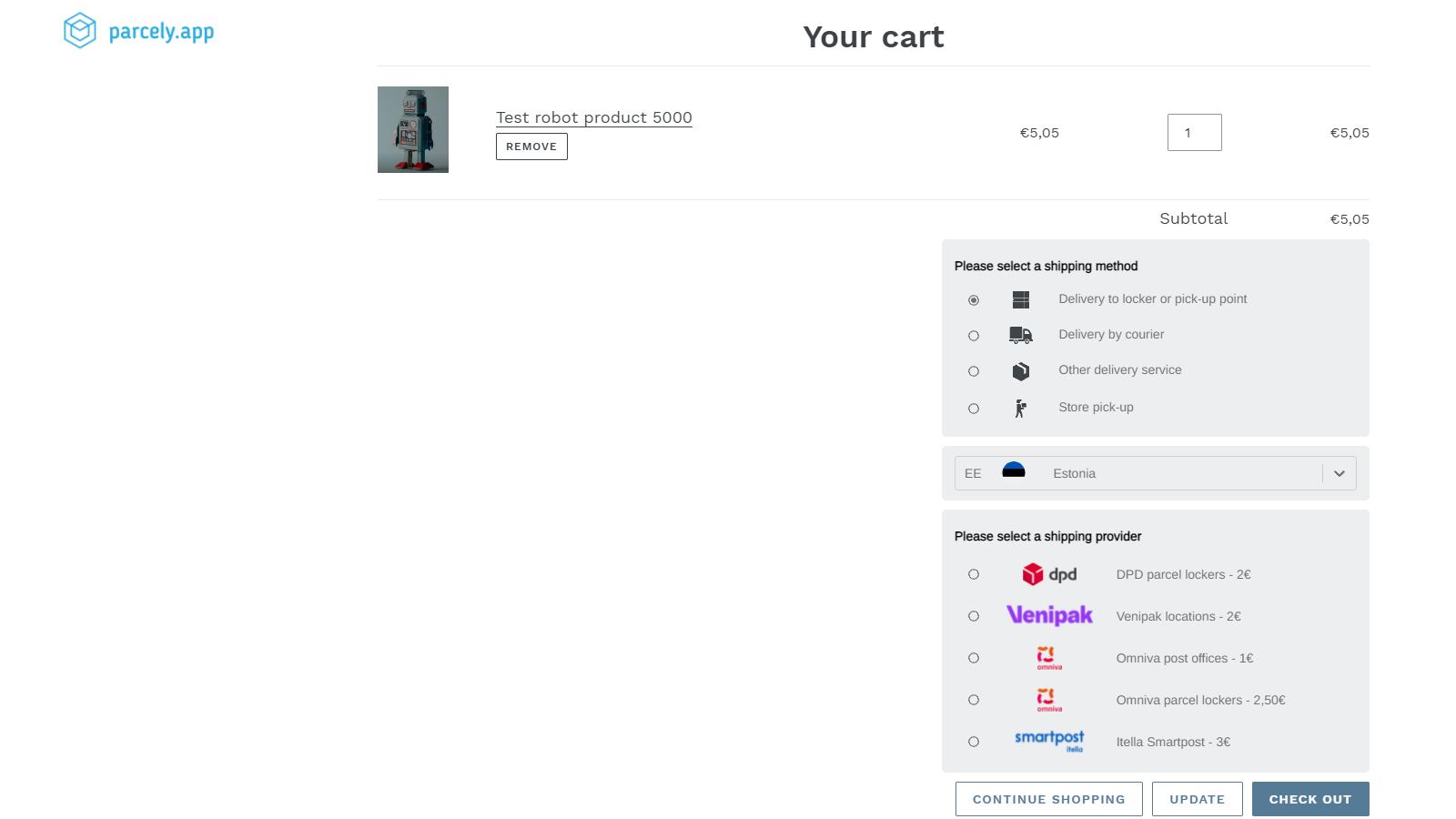 Your customers can easily choose any Omniva, DPD, DHL, Zasilkovna, Packeta, Venipak, LP EXPRESS, Itella SmartPost, Posti, Latvias Pastas, Matkahuolto, Foxpost, Magyar Posta MPL, Fanbox, PPL Parcelbox, GLS ParcelShop, Pick Pack Pont or Posti pick-up point location in your store checkout. For most of the integrated shipping service providers, we offer an option to export orders and print shipping labels. You can also add a tracking code automatically to order confirmation emails if needed.