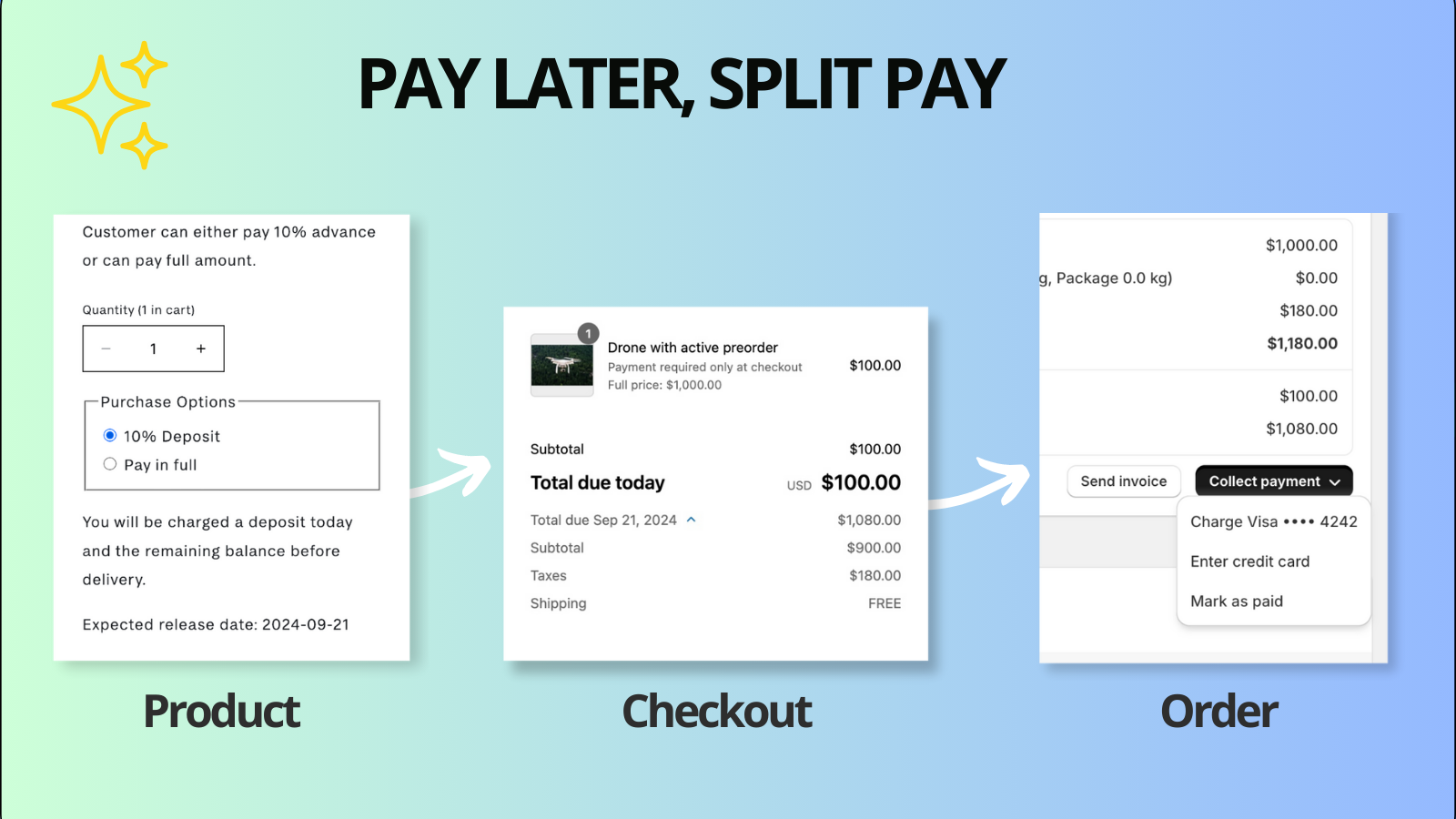 Customers are eager to buy your high-value, made-to-order preorders but may need flexible payment options. Offering Partial payment, Deferred Payment, Split payment, Deposits, Pay Later, NET30 or Pre Order payment options with card on file that can boost sales and loyalty. Set up payment reminders or charge the remaining balance from the card on file when shipping. Automate payment reminder emails. Increase your AOV with deposits and drive more sales with our platform.