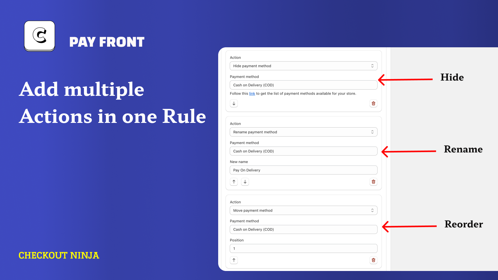 Simplify payment options and reduce costs with PayFront. Hide, sorting & renaming are made easy.