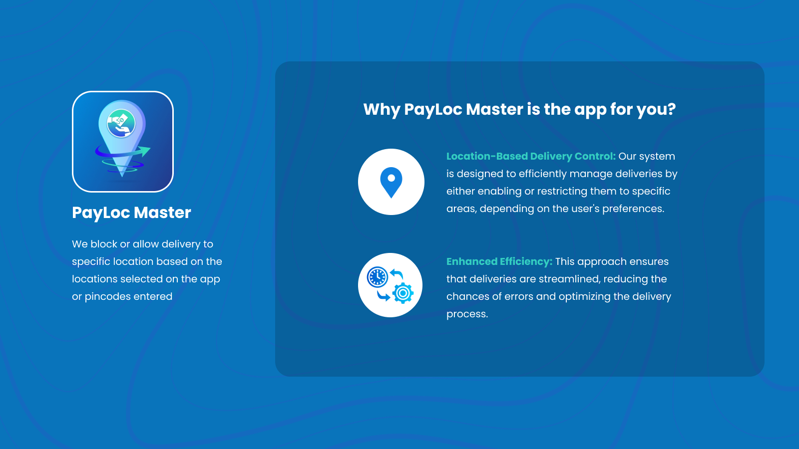 Efficiently manage your business and delivery operations with our app, PayLoc Master! Easily control delivery zones by specifying countries, states, or pincodes/zipcodes. Block or limit deliveries effortlessly in specific regions. Inputting pincodes/zipcodes is simple—use comma-separated codes or upload a CSV file. Elevate efficiency with customized checkout messages for restricted areas. Transform your store's delivery management with PayLoc Master!