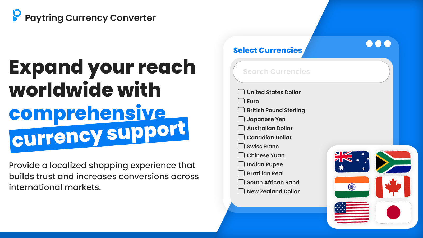 Our Multi-Currency App stands out as a comprehensive currency conversion solution that seamlessly integrates with Shopify stores to provide a truly localized shopping experience. Unlike basic currency display tools, our app offers end-to-end currency conversion from browsing to checkout, ensuring customers can shop entirely in their preferred currency without any confusion or conversion surprises. The app features an intuitive currency selector that customers can easily access from any page .