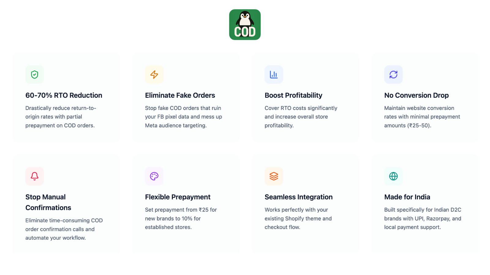 Advanced COD Cash on Delivery with Partial Prepaid Deposit. Reduce RTOs and fake orders.