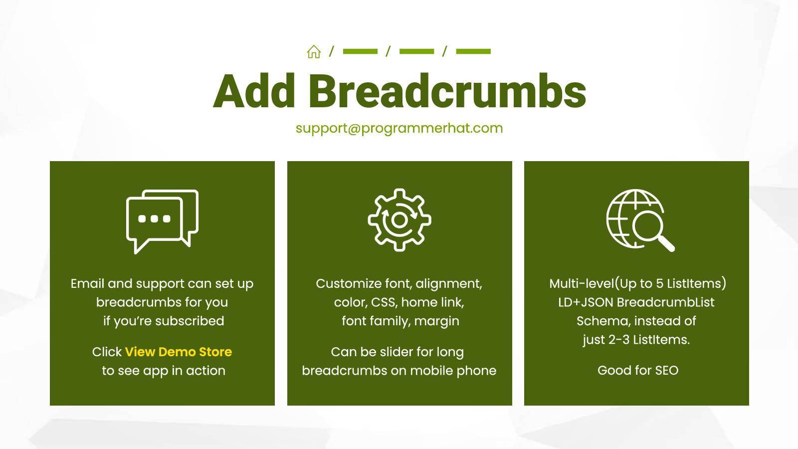 One of the best things about this app is that it can breadcrumblist SEO schema up to 5 levels, generated in HTML, not Javascript! Do you want to improve the navigational experience for each visitor to your Shopify store? Do you want to create a breadcrumbs hierarchy for Google and people to follow? Then this app is for you! Numerous config options to make it look great. Bread crumb navigation is automatically based on menu structure. You can also add bread crumbs on product pages.