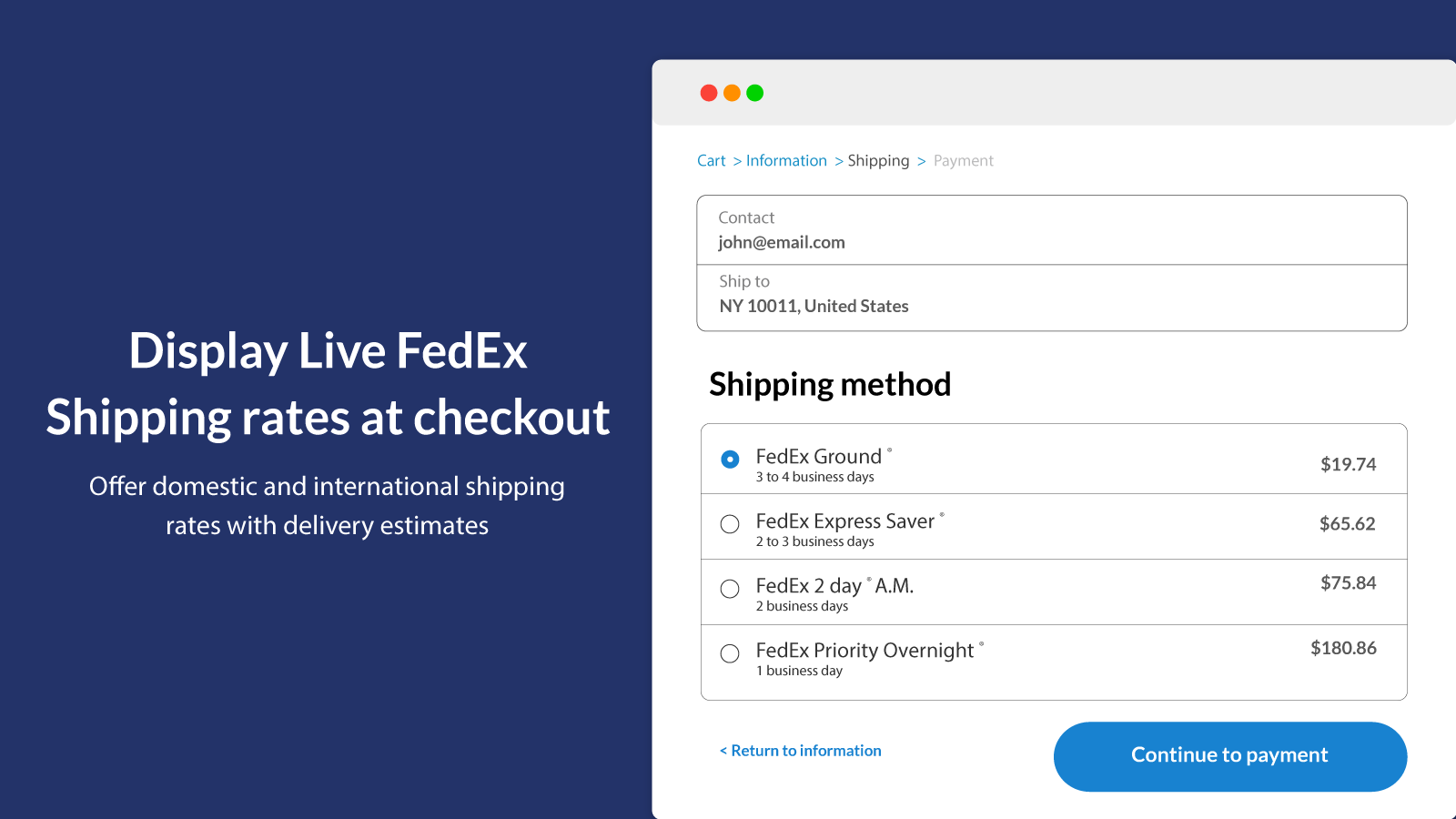 Connect the FedEx account to your store. Display realtime rates at checkout & print shipping labels.