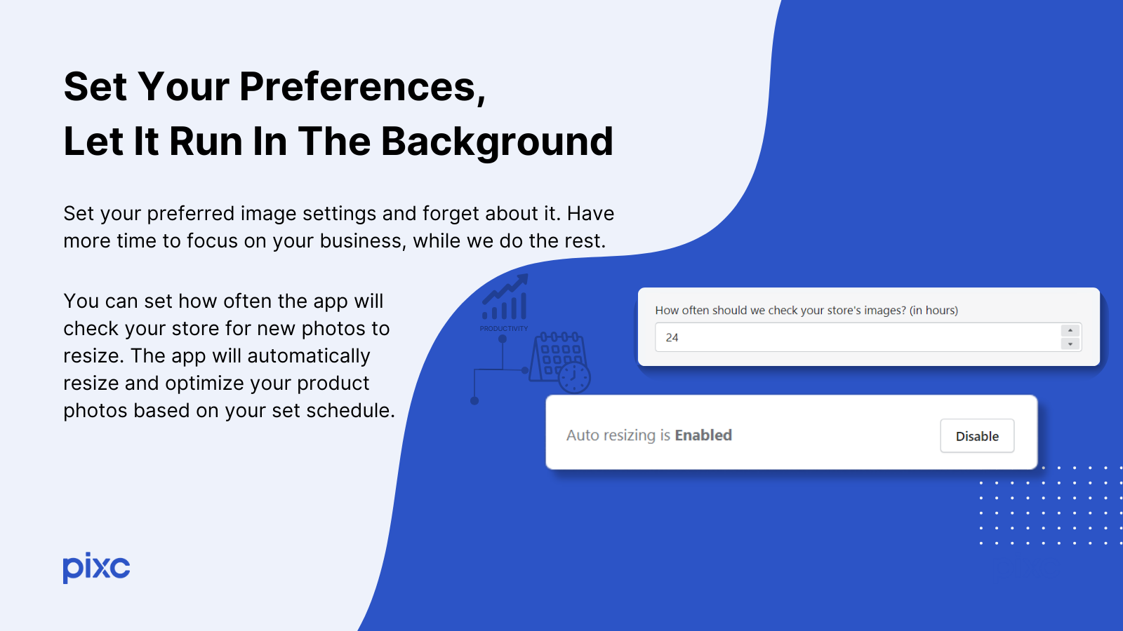 Pixc’s Photo Resize automatically resizes, optimizes, and updates your product photos so everything is uniform in your online store. This app will make your store look more professional while saving you time and effort so you can focus on growing your business. The app is designed to give you a better experience. The intuitive algorithm analyzes your store quickly, allowing for few-clicks resizing. Set your preferred image settings and let it work in the background for a seamless experience.