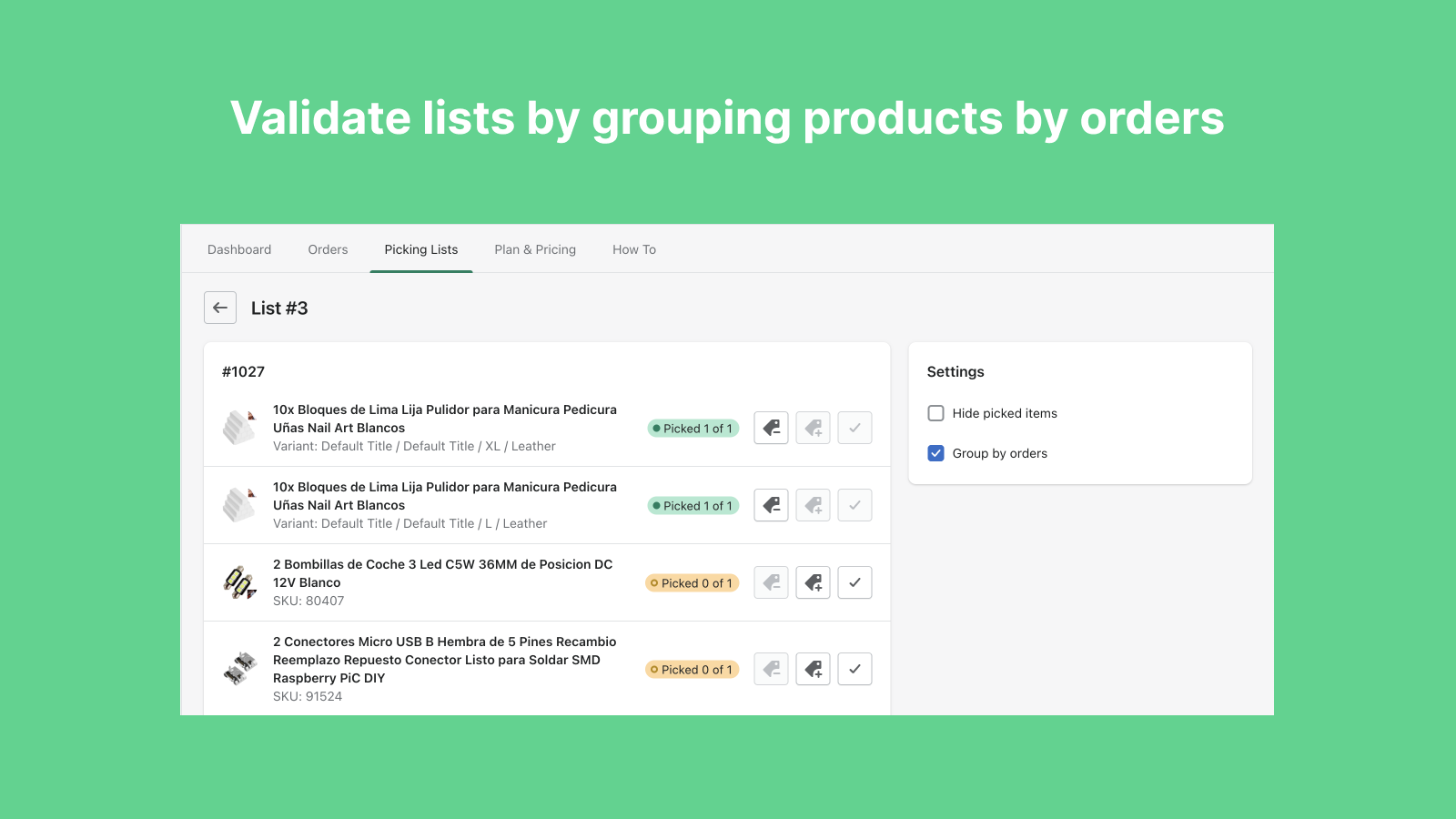Picking list wizard allows to create product picking lists from within Shopify app area. A picking list is usually is a document sent to your warehouse pickers to fulfill a customer order. A pick list communicates the items they will need to retrieve from inventory storage, including inventory SKU, quantity. Our app allows to easily create such digital picking list within the app and collaborate on them with your team. You can group products by order or pick products in alphabetic order.